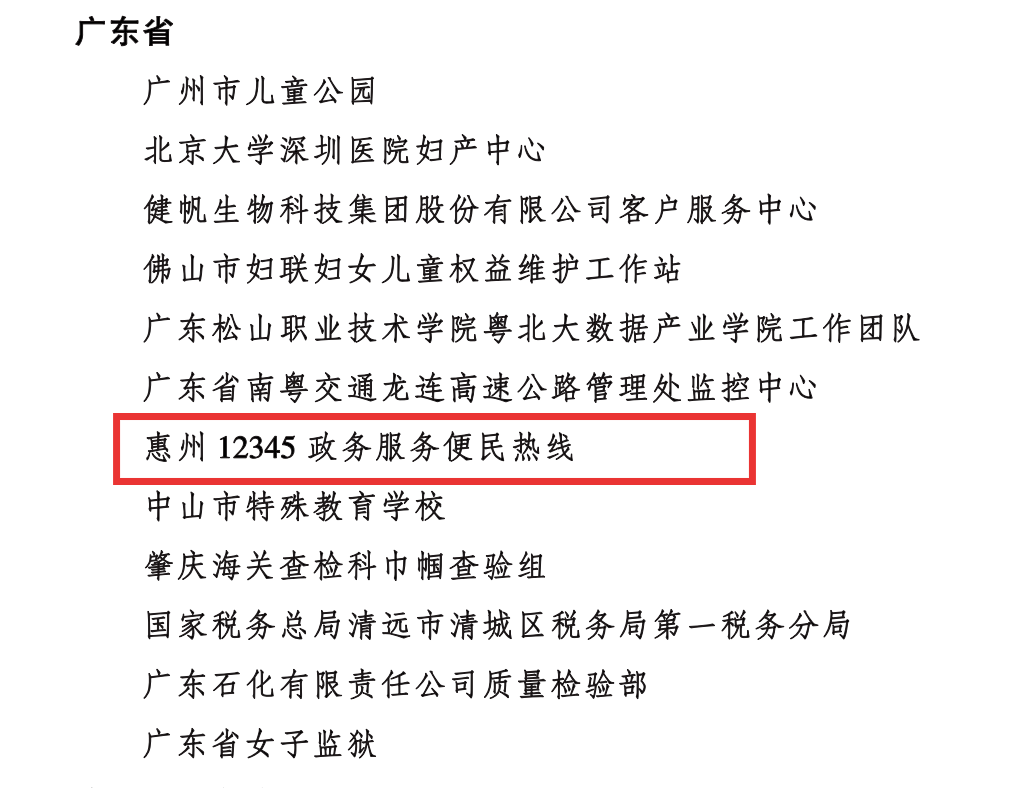 惠州12345政務服務便民熱線榮獲2024年度“全國三八紅旗集體”稱號,這是繼榮獲全國青年文明號、全國一星級青年文明號、全國巾幗文明崗、廣東省三八紅旗集體及廣東省工人先鋒號等稱號后,又一塊“國”字招牌。