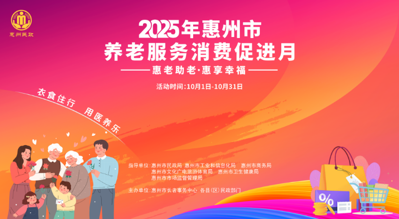 10月1日-31日,惠州市首屆“養老服務消費促進月”用滿滿的誠意,陪您過個暖心又實惠的專屬購物節!家有長輩的朋友,快把這個好消息告訴爸爸媽媽、爺爺奶奶;老年朋友們,記得約上好友,一起逛商場、享美食、游惠州。