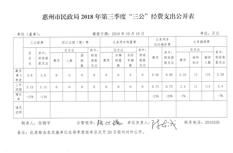 惠州市民政局2018年第三季度“三公”經(jīng)費(fèi)支出公開表