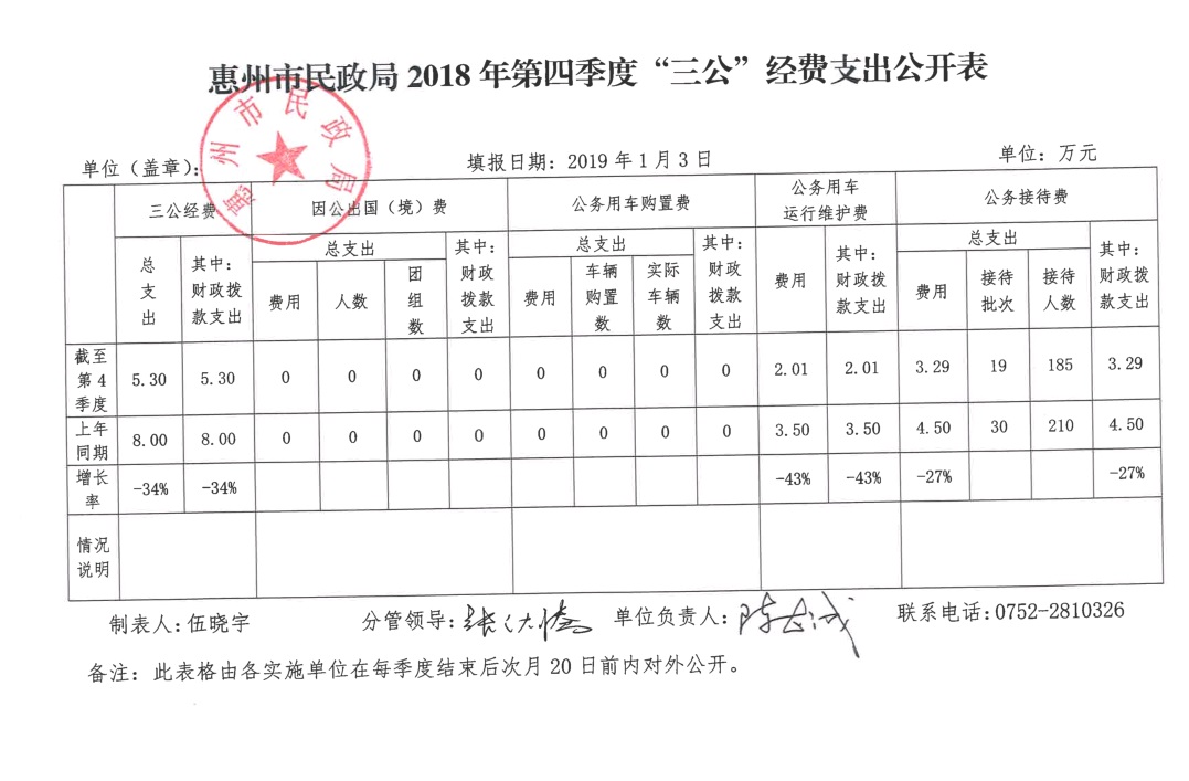 惠州市民政局2018年第四季度“三公”經費支出公開表
