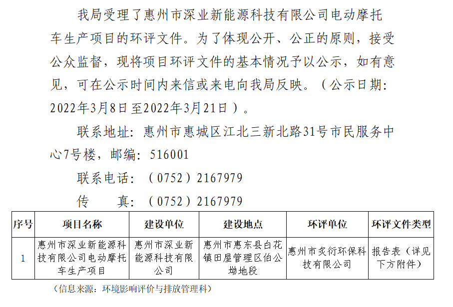 建設項目受理信息公示(惠州市深業新能源科技有限公司電動摩托車生產項目)