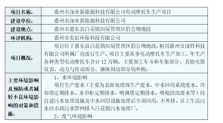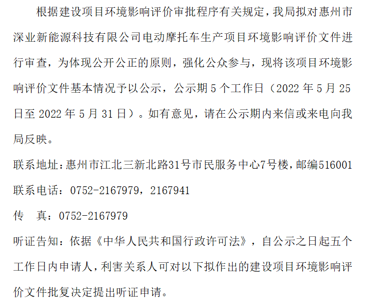 惠州市生態環境局擬對惠州市深業新能源科技有限公司電動摩托車生產項目環境影響評價文件進行審查的公示