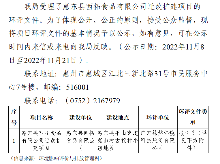建設項目受理信息公示(惠東縣西拓食品有限公司遷改擴建項目)