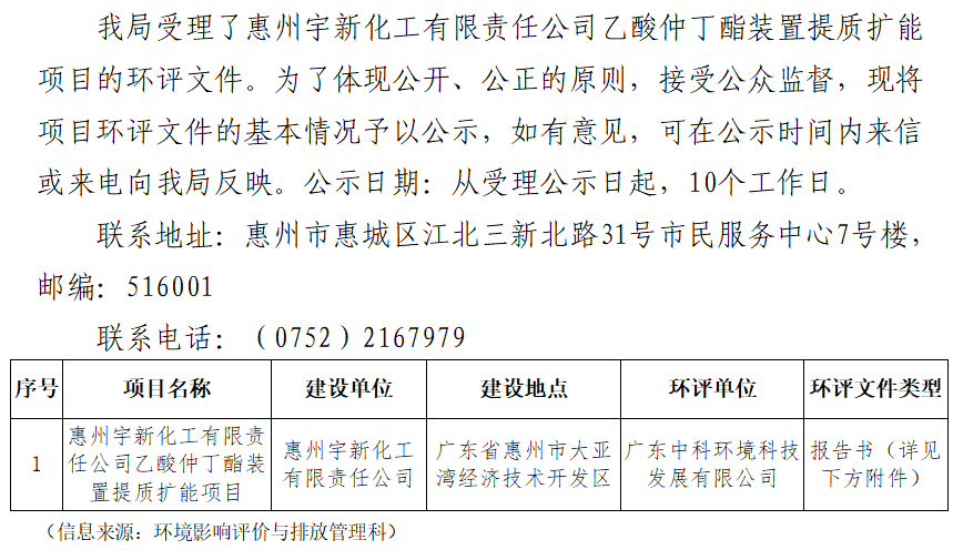 建設(shè)項(xiàng)目受理信息公示(惠州宇新化工有限責(zé)任公司乙酸仲丁酯裝置提質(zhì)擴(kuò)能項(xiàng)目)