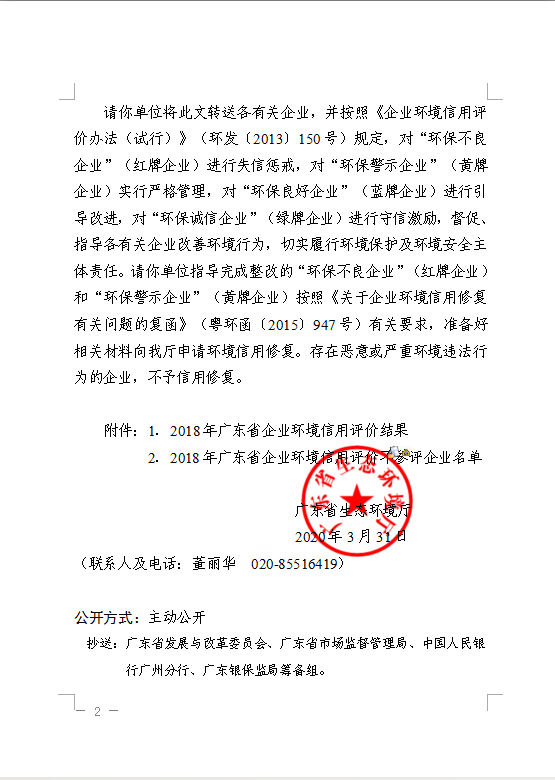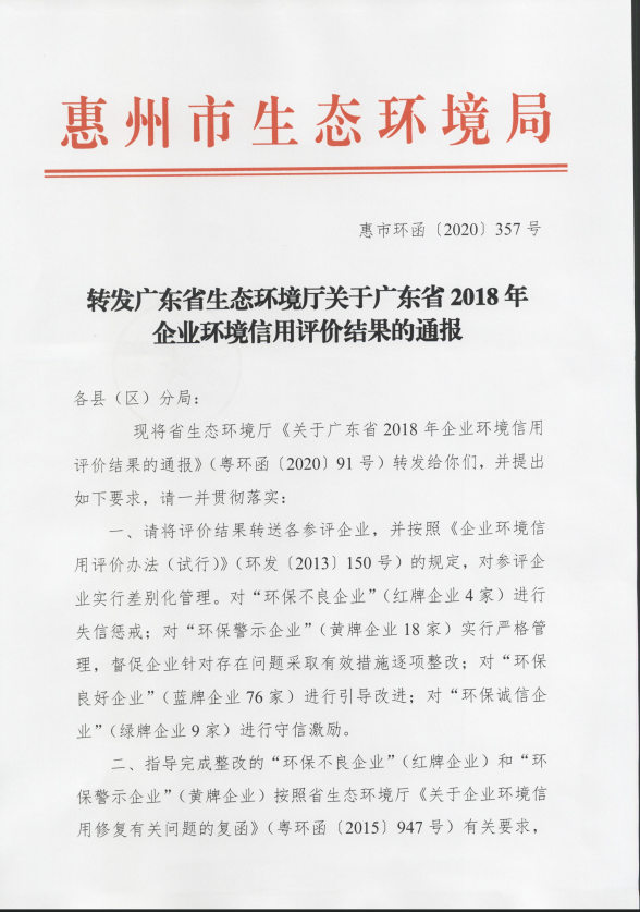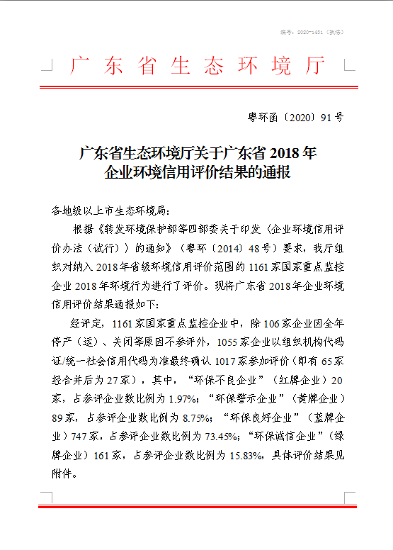 轉(zhuǎn)發(fā)廣東省生態(tài)環(huán)境廳關(guān)于廣東省2018年企業(yè)環(huán)境信用評價(jià)結(jié)果的通報(bào)