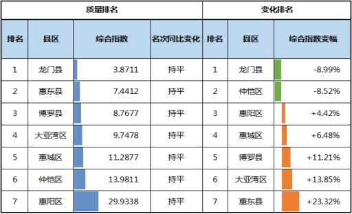 按照地表水環境質量考核斷面綜合指數排名,1-8月水環境質量由好到差依次排名為龍門縣、惠東縣、博羅縣、大亞灣區、惠城區、仲愷區、惠陽區。與2017年同期相比,龍門縣、仲愷區等2個縣區水環境質量有所改善,惠東縣、大亞灣區、博羅縣、惠城區、惠陽區等5個縣區有所變差。