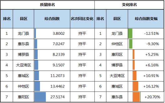 按照地表水環(huán)境質(zhì)量考核斷面綜合指數(shù)排名,1-9月水環(huán)境質(zhì)量由好到差依次排名為龍門(mén)縣、惠東縣、博羅縣、大亞灣區(qū)、惠城區(qū)、仲愷區(qū)、惠陽(yáng)區(qū)。與2017年同期相比,龍門(mén)縣、仲愷區(qū)等2個(gè)縣區(qū)水環(huán)境質(zhì)量有所改善,惠東縣、惠城區(qū)、大亞灣區(qū)、博羅縣、惠陽(yáng)區(qū)等5個(gè)縣區(qū)有所變差。