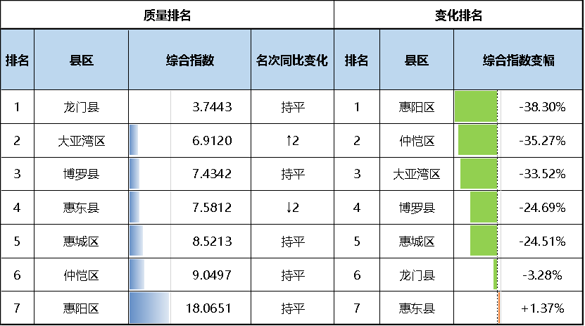 按照地表水環境質量考核斷面綜合指數排名,2019年1-8月,水環境質量由好到差依次排名為龍門縣、大亞灣區、博羅縣、惠東縣、惠城區、仲愷區、惠陽區。與2018年同期相比,惠陽區、仲愷區、大亞灣區、博羅縣、惠城區、龍門縣等6個縣區水環境質量有所改善,惠東縣水環境質量有所變差。