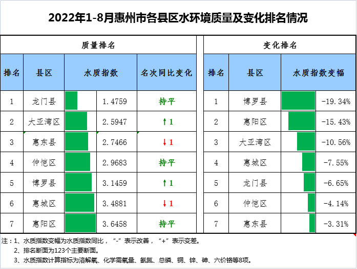“十四五”國(guó)家地表水環(huán)境質(zhì)量監(jiān)測(cè)網(wǎng)的11個(gè)國(guó)控?cái)嗝嫠|(zhì)優(yōu)良率100%(11個(gè)),劣Ⅴ類比例為0%。 2022年1-8月,根據(jù)水質(zhì)指數(shù)排名,水環(huán)境質(zhì)量由好到差依次排名為龍門縣、大亞灣區(qū)、惠東縣、仲愷區(qū)、博羅縣、惠城區(qū)、惠陽區(qū)。與2021年同期相比,博羅縣、惠陽區(qū)、大亞灣區(qū)、惠城區(qū)、龍門縣、仲愷區(qū)、惠東縣等7個(gè)縣區(qū)水環(huán)境質(zhì)量均有所改善。