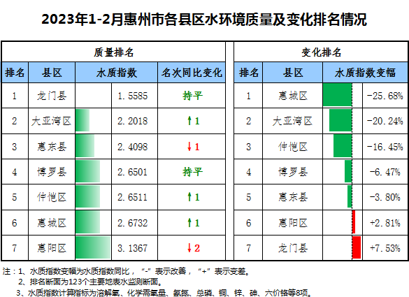 2023年1-2月,根據水質指數排名,水環境質量由好到差依次排名為龍門縣、大亞灣區、惠東縣、博羅縣、仲愷區、惠城區、惠陽區。與2022年同期相比,惠城區、大亞灣區、仲愷區、博羅縣、惠東縣等5個縣區水環境質量有所改善,龍門縣、惠陽區等2個縣區水環境質量有所下降。