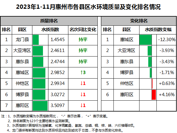 2023年1-11月,根據水質指數排名,水環境質量由好到差依次排名為龍門縣、大亞灣區、惠東縣、惠城區、仲愷區、博羅縣、惠陽區。與2022年同期相比,惠城區、大亞灣區、惠東縣、博羅縣等4個縣區水環境質量有所改善,惠陽區、仲愷區水環境質量有所下降。