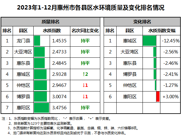 2023年1-12月,根據水質指數排名,水環境質量由好到差依次排名為龍門縣、大亞灣區、惠東縣、惠城區、仲愷區、博羅縣、惠陽區。與2022年同期相比,惠城區、大亞灣區、惠東縣、博羅縣、仲愷區等5個縣區水環境質量有所改善,惠陽區水環境質量有所下降。