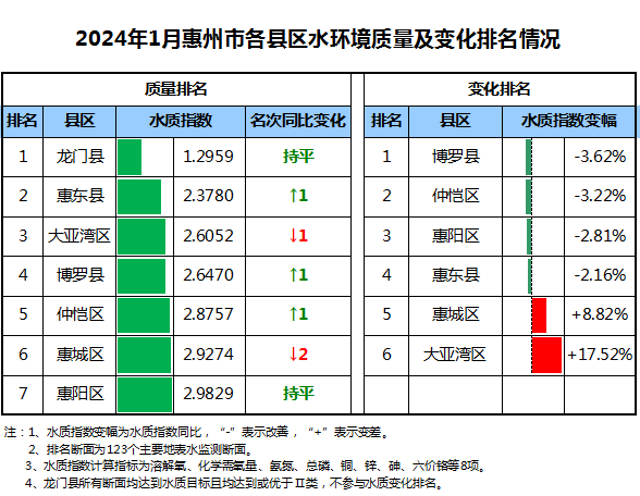 “十四五”國家地表水環(huán)境質(zhì)量監(jiān)測網(wǎng)的11個國控斷面水質(zhì)優(yōu)良率100%(11個),劣Ⅴ類比例為0%。 縣區(qū)排名:2024年1月,根據(jù)水質(zhì)指數(shù)排名,水環(huán)境質(zhì)量由好到差依次排名為龍門縣、惠東縣、大亞灣區(qū)、博羅縣、仲愷區(qū)、惠城區(qū)、惠陽區(qū)。與2023年同期相比,博羅縣、仲愷區(qū)、惠陽區(qū)、惠東縣等4個縣區(qū)水環(huán)境質(zhì)量有所改善,大亞灣區(qū)、惠城區(qū)等2個縣區(qū)水環(huán)境質(zhì)量有所下降。