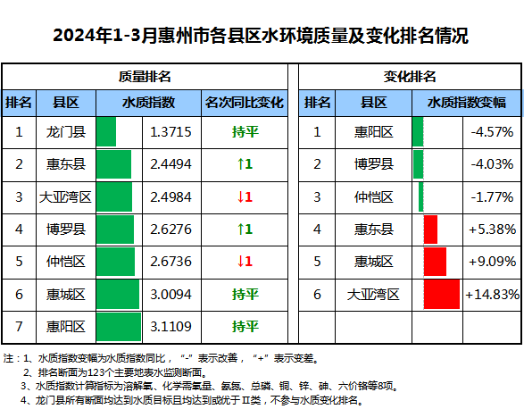 “十四五”國家地表水環(huán)境質(zhì)量監(jiān)測網(wǎng)的11個國控斷面水質(zhì)優(yōu)良率90.0%(10個),劣Ⅴ類比例為0%。 2024年1-3月,根據(jù)水質(zhì)指數(shù)排名,水環(huán)境質(zhì)量由好到差依次排名為龍門縣、惠東縣、大亞灣區(qū)、博羅縣、仲愷區(qū)、惠城區(qū)、惠陽區(qū)。與2023年同期相比,惠陽區(qū)、博羅縣、仲愷區(qū)等3個縣區(qū)水環(huán)境質(zhì)量有所改善,大亞灣區(qū)、惠城區(qū)、惠東縣等3個縣區(qū)水環(huán)境質(zhì)量有所下降。