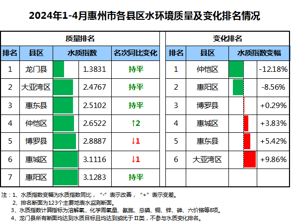 2024年1-4月,根據水質指數排名,水環境質量由好到差依次排名為龍門縣、大亞灣區、惠東縣、仲愷區、博羅縣、惠城區、惠陽區。與2023年同期相比,仲愷區、惠陽區2個縣區水環境質量有所改善,博羅縣、惠城區、惠東縣、大亞灣區等4個縣區水環境質量有所下降。