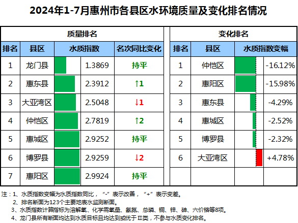 2024年1-7月,根據水質指數排名,水環境質量由好到差依次排名為龍門縣、惠東縣、大亞灣區、仲愷區、惠城區、博羅縣、惠陽區。與2023年同期相比,仲愷區、惠陽區、惠東縣、惠城區、博羅縣等5個縣區水環境質量有所改善,大亞灣區水環境質量有所下降。
