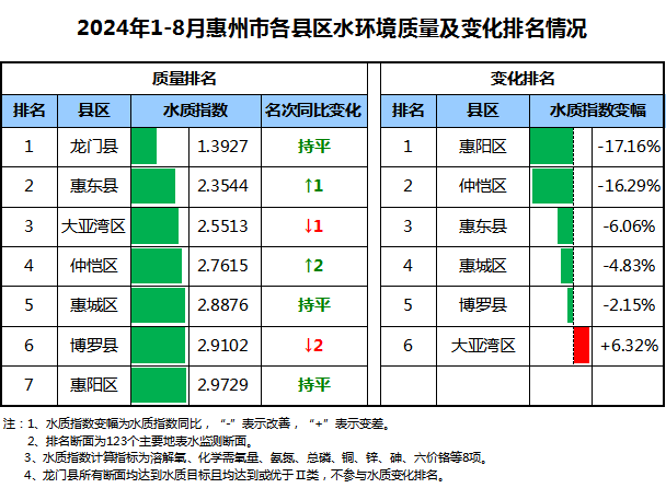 2024年1-8月,根據水質指數排名,水環境質量由好到差依次排名為龍門縣、惠東縣、大亞灣區、仲愷區、惠城區、博羅縣、惠陽區。與2023年同期相比,惠陽區、仲愷區、惠東縣、惠城區、博羅縣等5個縣區水環境質量有所改善,大亞灣區水環境質量有所下降。