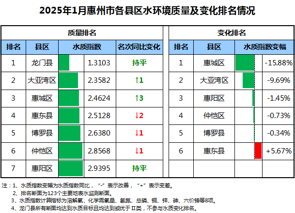 縣區排名:2025年1月,根據水質指數排名,水環境質量由好到差依次排名為龍門縣、大亞灣區、惠城區、惠東縣、博羅縣、仲愷區、惠陽區。與2024年同期相比,惠城區、大亞灣區、惠陽區、仲愷區、博羅縣等5個縣區水環境質量有所改善,惠東縣水環境質量有所下降。
