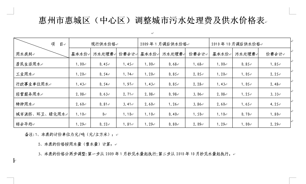 附表:惠州市惠城區(qū)(中心區(qū))調(diào)整城市污水處理費(fèi)及供水價格表