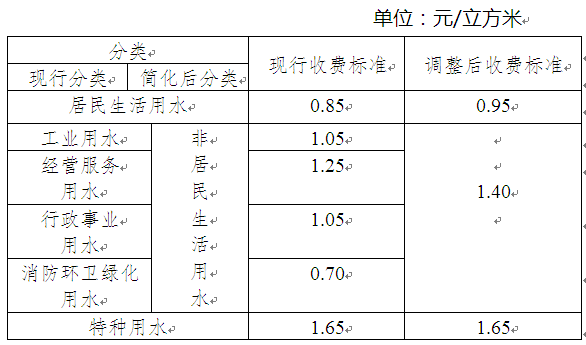居民生活用水的污水處理費標準從現行每立方米0.85元調整為0.95元,非居民生活用水的污水處理費標準統一調整為每立方米1.40元,特種用水的污水處理費標準維持現行每立方米1.65元不變。調整前后的分類及收費標準見下表: