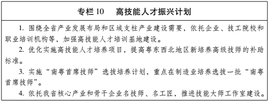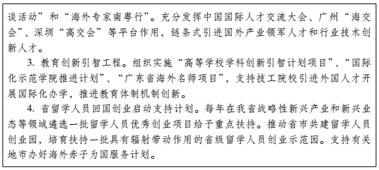 (四)優化人才公共服務機制。完善人才引進和服務政策,建立高層次人才、高技能人才引進“綠色通道”。促進粵港澳地區人才自由流動,鼓勵引進港澳創新人才和創新資源,建設粵港澳創業創新合作示范園區。大力引進海外高層次人才,支持高層次留學人員攜尖端技術、高端項目來粵創業。制定外國人才來粵工作服務與管理暫行辦法。完善外國人才在粵工作信用和監管體系。(省人力資源社會保障廳、公安廳、外辦、港澳辦負責)