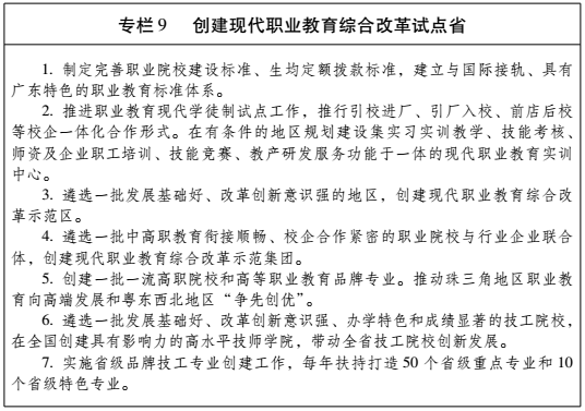 (六)加快高水平職業院校和技師學院建設。建設一批國內領先、國際知名的高水平技師學院和高職院校。強化職業院校和技工院校師資力量建設,打造一流的師資隊伍。加大職業教育和技工教育科研支持力度,加強重點專業和特色專業建設,培育一流優勢特色專業和科研成果。鼓勵技工院校創新發展,深化與德國、澳大利亞等發達國家辦學合作,探索職業技術教育沿高端、特色路線發展。(省教育廳、人力資源社會保障廳負責)