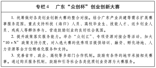 (四)激發各類人才創業創新活力。細化促進高校畢業生、退役軍人、殘疾人、登記失業人員等群體創業補貼扶持政策。高校、科研院所等單位的專業技術人員經原單位同意,可攜科研項目和成果,保留基本待遇到企業開展創新工作或創業。大力支持異地務工人員等返鄉創業。引導城鎮失業人員等其他各類人員以創業促就業。有效整合各部門、各領域創業創新政策資源,統籌做好廣東“眾創杯”等各類創業創新大賽。(省人力資源社會保障廳、教育廳、科技廳,省殘聯負責)
