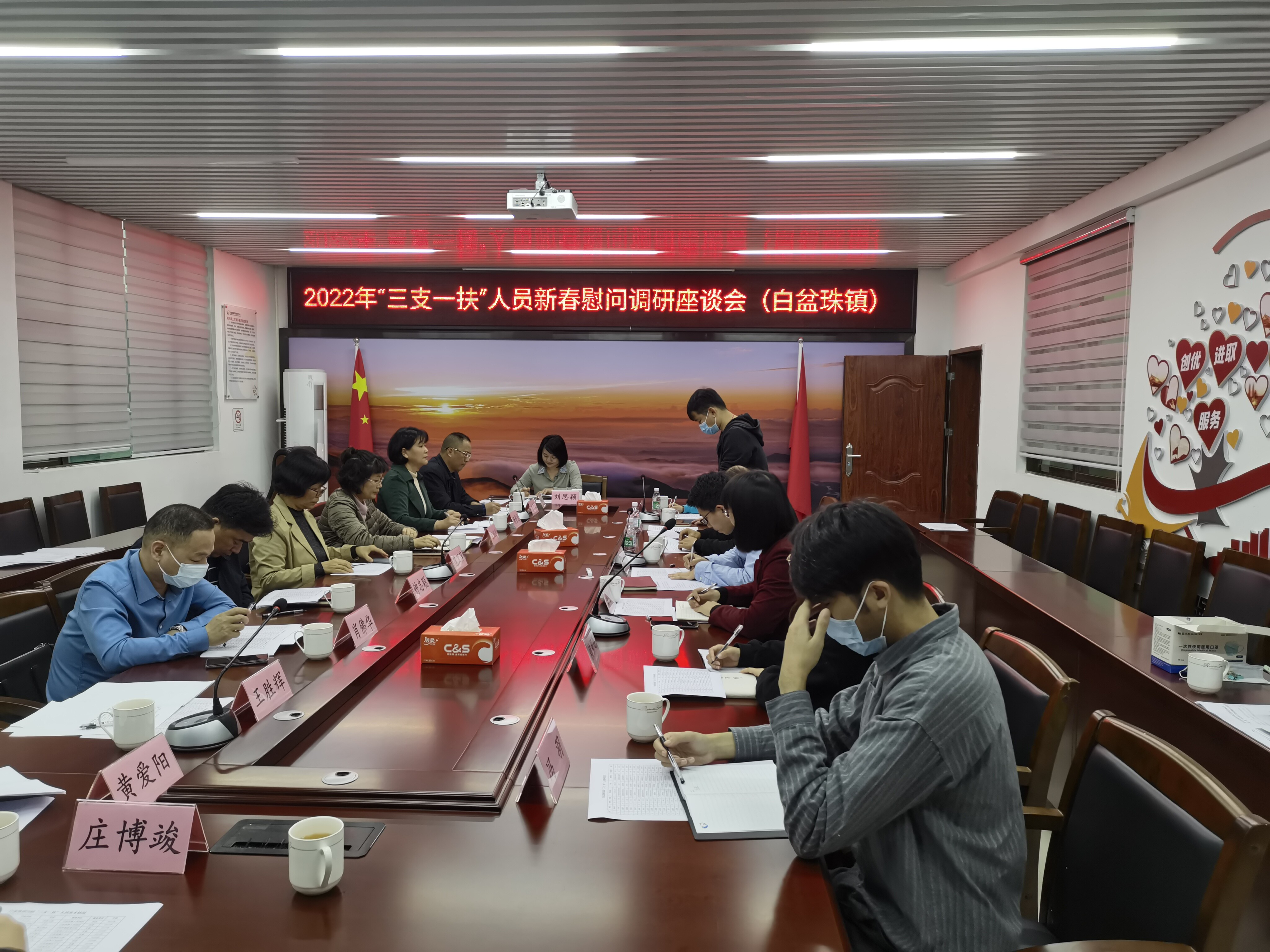 新春伊始,為深入了解我市基層“三支一扶”人員的工作和生活情況,充分體現黨和政府對“三支一扶”人員的關心和愛護。1月7日下午,市人社局副局長范衛萍,市委組織部四級調研員、人才科科長呂川抒率調研組一行,深入到惠東縣多祝鎮、白盆珠鎮開展2022年“三支一扶”人員新春慰問暨調研有關工作。  慰問調研組采取實地走訪慰問、召開座談會等方式進行。在座談會上,慰問調查組一行認真聽取惠東縣“三支一扶”工作情況介紹,詳細了解“三支一扶”人員的基本情況,在與“三支一扶”代表人員深入交談、聽取意見和建議后,范衛萍同志對惠東縣“三支一扶”工作表達了肯定,她指出實施“三支一扶”基層服務計劃是國家推進鄉村振興,加強鄉村人才隊伍建設、促進高校畢業生成長成才的重要舉措,廣大“三支一扶”人員在基層勤奮工作、積極進取,為農村基層各項事業建設中發揮了重要作用。范衛萍同志還鼓勵“三支一扶”人員發揚勇挑重擔、甘于奉獻、積極創新、不忘初心的精神,立足基層、服務基層、扎根基層,為實現偉大中國夢貢獻我們一份力量。