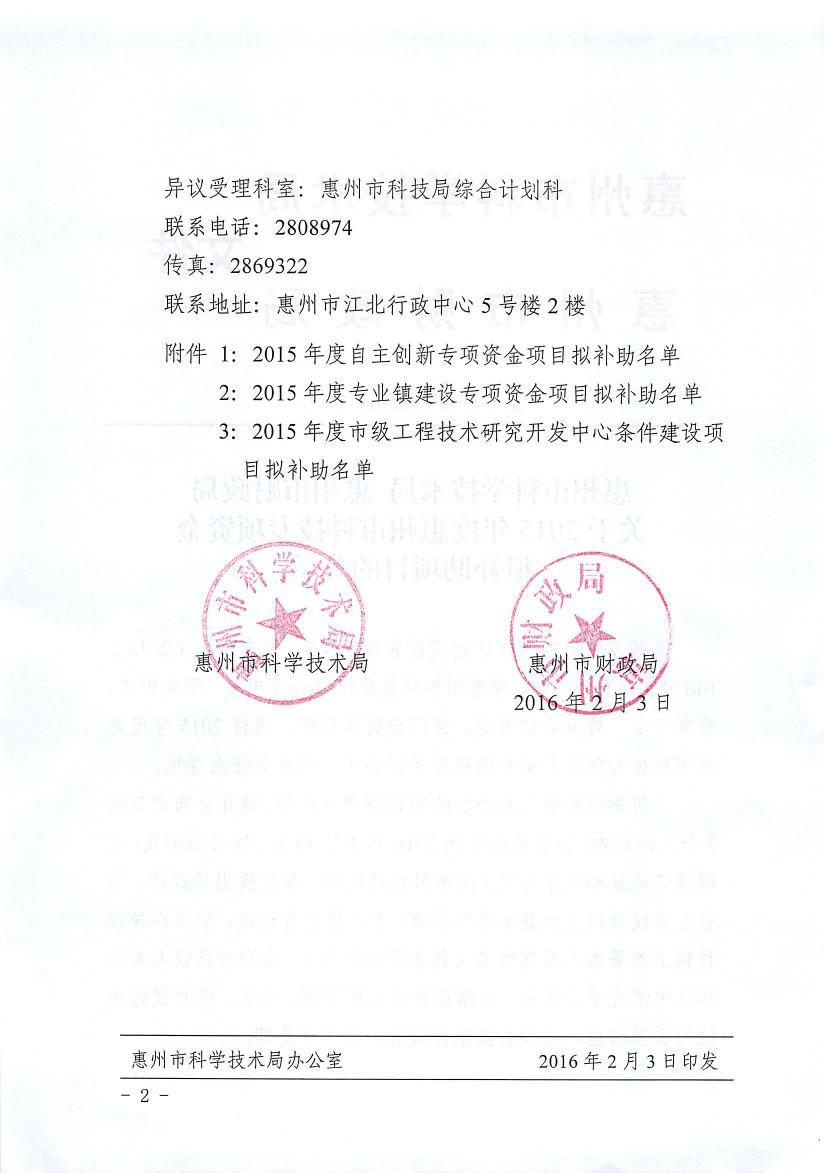 惠州市科學技術局 惠州市財政局關于2015年度惠州市科技專項資金擬補助項目的公示