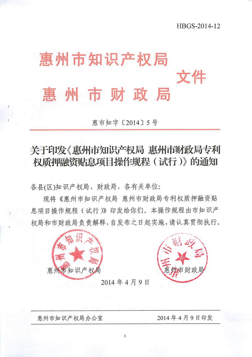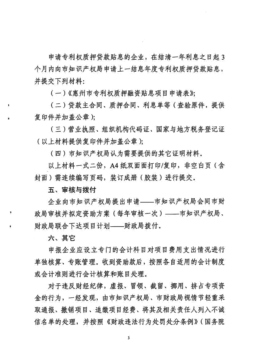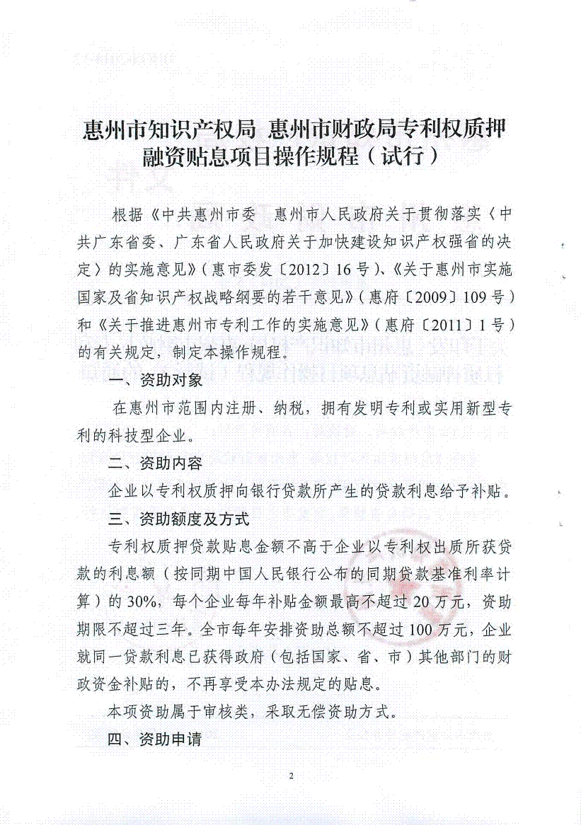 關(guān)于印發(fā)《惠州市知識產(chǎn)權(quán)局 惠州市財政局專利權(quán)質(zhì)押融資貼息項目操作規(guī)程(試行)的通知》