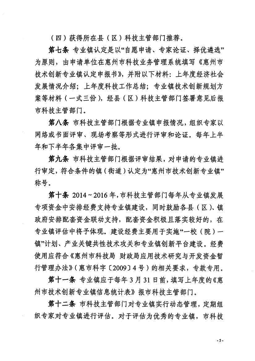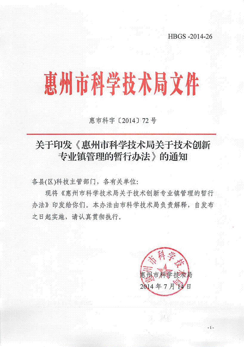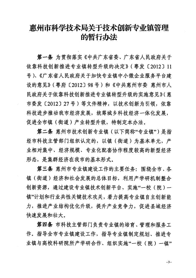 關于印發《惠州市科學技術局關于技術創新專業鎮管理的暫行辦法》的通知