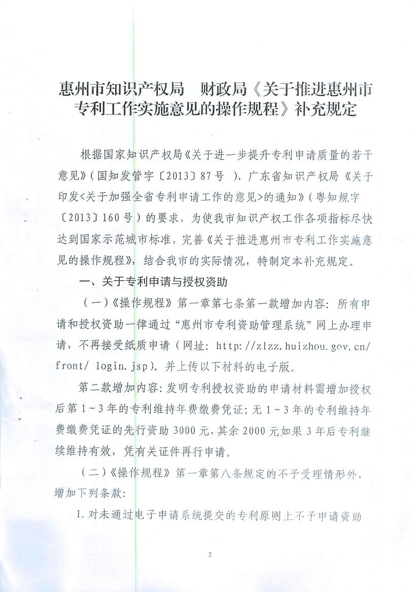關于印發《惠州市知識產權局 財政局關于推進惠州市專利工作實施意見的操作規程補充規定》的通知