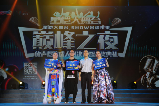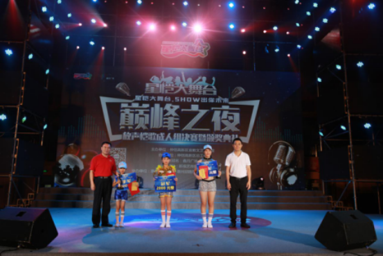 區社會組織黨委副書記孫孟龍,新視藝傳媒集團董事長黃小坤為“放聲愷歌”少兒組冠軍亞季軍頒發獎杯、榮譽證書以及現金大獎
