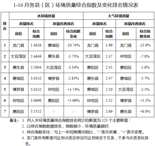 1-10月,全市環境空氣質量綜合指數為2.44,同比上年下降4.3%。優良率為98%,同比上年上升5.6個百分點,空氣質量和優良率均排名珠三角城市首位。