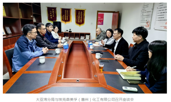 大亞灣分局局長黃海波收下了錦旗并與來訪代表進(jìn)行了座談,感謝埃克森美孚(惠州)化工有限公司一直以來對(duì)生態(tài)環(huán)境保護(hù)工作的理解和支持,并就美孚公司系列項(xiàng)目推進(jìn)情況進(jìn)行了深入交流。