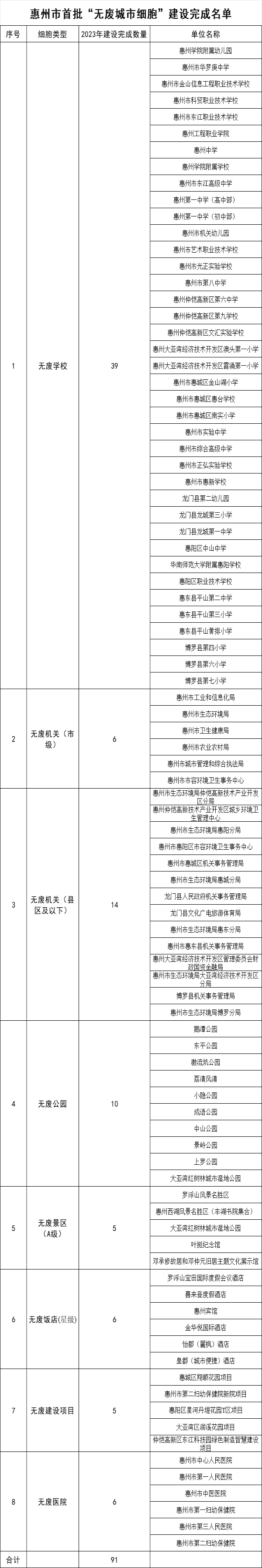 開展“無廢城市”建設,是深入落實黨中央、國務院決策部署的具體行動,是實現高質量發展和高品質生活的必然要求,有助于樹立生態文明觀念,推進生態優先、低碳發展的新模式。“無廢細胞”創建,是踐行“無廢城市”建設理念的重要載體,對促進形成資源節約、環境友好生產方式和簡約適度、綠色低碳生活方式具有重要推動作用。 今年9月,我市正式印發《惠州市“無廢城市細胞”建設工作方案(試行)》,通過推動機關、學校、醫院、景區等細胞開展“無廢城市細胞”創建,引導全社會共同參與“無廢城市”建設。經創建單位申報、各牽頭部門評估鑒定、市無廢辦抽查復核,我市首批“無廢城市細胞”評選結果(7種類型共計91個“無廢城市細胞”)已正式出爐!現正式發布惠州市首批“無廢城市細胞”建設完成名單: