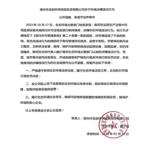 公開道歉 惠州市龍創環保項目投資有限公司環保公開道歉承諾書