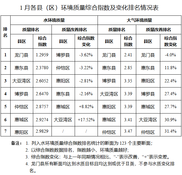 1月,全市環境空氣質量綜合指數為3.38,同比上年上升27.1%;優良率為100%,同比上年持平。