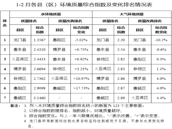 1-2月,全市環境空氣質量綜合指數為2.91,同比上年下降5.1%;優良率為100%,同比持平。空氣質量排名珠三角城市第2,優良率排名第1。