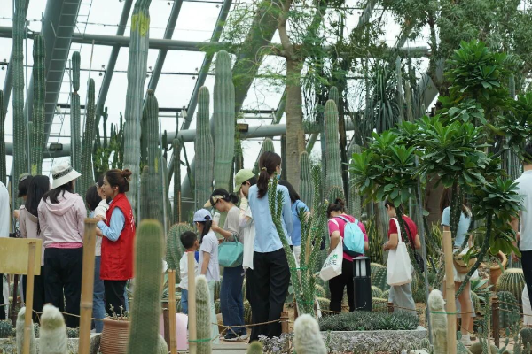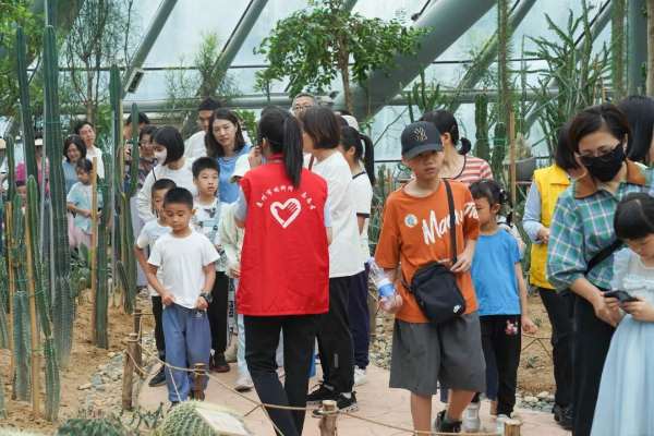 第二環(huán)節(jié),小朋友們跟隨生態(tài)環(huán)境講解員和志愿者的腳步來(lái)到沙生館。實(shí)地觀察沙生植物“真面目”,講解員為家長(zhǎng)和小朋友介紹了各種沙生植物名稱,小朋友對(duì)眼前那一棵棵形態(tài)不一,渾身長(zhǎng)滿尖刺的植物表現(xiàn)出強(qiáng)烈的好奇心,甚至有些小朋友躍躍欲試地想上前觸摸,志愿者微笑著說(shuō)“植物們很頑強(qiáng)也很脆弱,我們要小心呵護(hù)哦”。