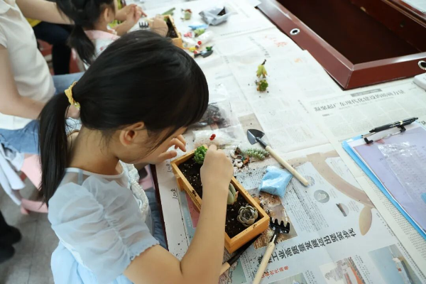 第三環(huán)節(jié),參觀完沙生館,小朋友表示也想擁有屬于自己的沙生植物,正巧,這一環(huán)節(jié)就是手動(dòng)DIY沙生盆栽。小朋友興奮地接過(guò)物料,馬上就緊鑼密鼓地動(dòng)起手來(lái),有些先給松松沙土,有些小心翼翼地把植物擺進(jìn)木盆中,不一會(huì)兒小朋友就完成了自己的作品,臉上洋溢著自豪的笑容。