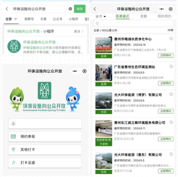梅湖水質凈化中心 龍門縣西林水質凈化有限公司 開放時間 2024年6月3日至5日 開放內容 參觀龍門縣西林水質凈化有限公司,了解污水廠整體運行情況,學習污水處理的全流程。 開放地點 龍門縣城污水處理廠 廣東省惠州生態環境監測站 開放時間 2024年6月5日 開放內容 參觀水質采樣無人機、VOC氣體檢測儀、紅外熱成像氣體檢漏儀等環境監測設備,學習水質采樣、氣體檢測原理,“零距離”感受現代化監測技術。 開放地點 惠州市金湖路紅仔石嶺15號 光大環保能源(博羅)有限公司 開放時間 2024年6月5日 開放地點 博羅縣光大環保能源(博羅)有限公司 惠州東江威立雅環境服務有限公司 開放時間 2024年6月5日至7日 開放地點 廣東省惠州市惠東縣梁化鎮石屋寮南坑惠州東江威立雅環境服務有限公司