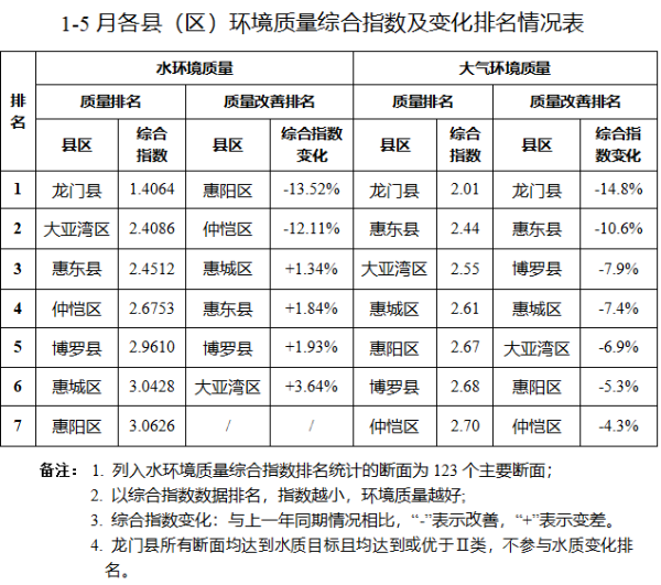 (二)空氣環境質量狀況:1-5月,全市環境空氣質量綜合指數為2.64,同比上年改善5.4%;優良率為97.4%,同比下降1.3個百分點。空氣質量和優良率均排名珠三角城市第1。