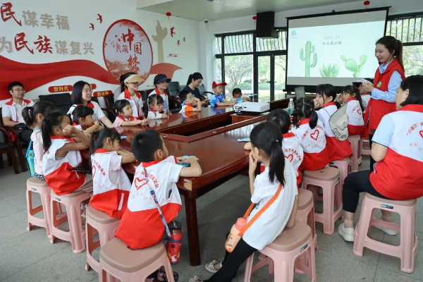伴隨著夏日的陽光,生態環境講解員為市機關二幼的小朋友們開展一場關于沙生植物的知識講座。小朋友們認真學習各種植物的種類、特性,爭相回答問題,現場氣氛積極踴躍。