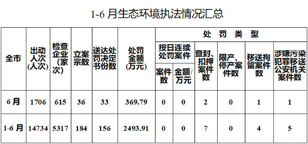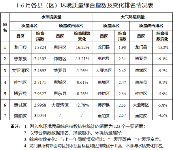 一、全市環(huán)境質(zhì)量狀況 (一)國省考斷面水質(zhì)狀況 1-6月,19個(gè)省考斷面水質(zhì)達(dá)標(biāo)率100%、優(yōu)良率94.7%,11個(gè)國考斷面水質(zhì)優(yōu)良率100%,劣V類比例為0。 (二)空氣環(huán)境質(zhì)量狀況 1-6月,全市環(huán)境空氣質(zhì)量綜合指數(shù)為2.52,同比改善3.1%;優(yōu)良率為97.8%,同比上年持平。空氣質(zhì)量?jī)?yōu)良率、空氣質(zhì)量指數(shù)分別排名珠三角城市第1和第2。