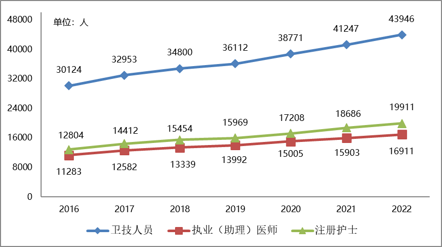 2016-2022年全市醫(yī)療衛(wèi)生機(jī)構(gòu)衛(wèi)生技術(shù)人員數(shù)
