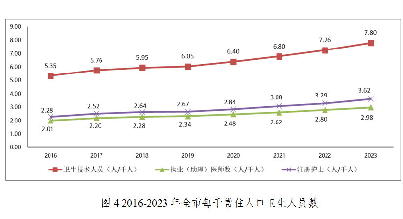 按學(xué)歷職稱分:醫(yī)療衛(wèi)生機(jī)構(gòu)中,高級(jí)職稱在崗職工4513人,本科及以上學(xué)歷在崗職工19123人。高級(jí)職稱衛(wèi)生技術(shù)人員4395人,本科以上學(xué)歷衛(wèi)生技術(shù)人員16930人,占比分別為9.28%、35.73%。 千人口指標(biāo):按常住人口統(tǒng)計(jì),全市每千人口執(zhí)業(yè)(助理)醫(yī)師2.98人,注冊(cè)護(hù)士3.62人,分別比上年增加0.18人、0.33人;每萬(wàn)人口全科醫(yī)生數(shù)4.11人,較上年增加0.22人。
