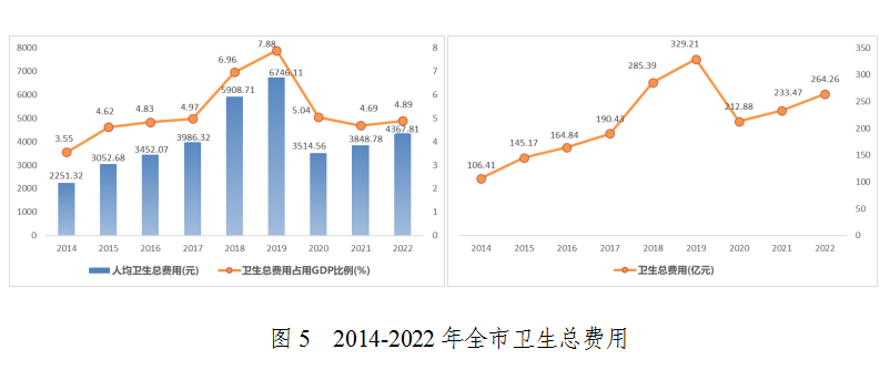 (四)設(shè)備及房屋建筑面積。截至2023年底,全市醫(yī)療衛(wèi)生機(jī)構(gòu)擁有萬(wàn)元以上設(shè)備臺(tái)數(shù)達(dá)44412臺(tái),較上年增加6163臺(tái)(增長(zhǎng)16.11%),其中:10-49萬(wàn)設(shè)備9432臺(tái)、50-99萬(wàn)設(shè)備1614臺(tái)、100萬(wàn)及以上設(shè)備1443臺(tái)。全市醫(yī)療衛(wèi)生機(jī)構(gòu)房屋建筑面積(含租房面積)達(dá)356.61萬(wàn)平方米,平均每家醫(yī)院、衛(wèi)生院、社區(qū)衛(wèi)生服務(wù)中心房屋建筑面積分別為24559.05、6407.60、4021.90平方米。 (五)衛(wèi)生總費(fèi)用。2022年,全市衛(wèi)生總費(fèi)用264.26億元,占全市GDP的4.89%,其中:政府衛(wèi)生支出,社會(huì)衛(wèi)生支出,個(gè)人現(xiàn)金衛(wèi)生支出占比分別為28.64%、47.99%、23.37%。與2021年相比,衛(wèi)生總費(fèi)用總量增長(zhǎng)13.19%,占GDP的比重提高0.2個(gè)百分點(diǎn)。