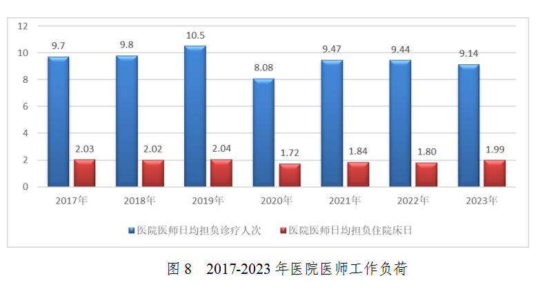 手術(shù)量:全年醫(yī)療機(jī)構(gòu)住院病人手術(shù)49.40萬(wàn)人次,較上年增長(zhǎng)14.27%,其中:醫(yī)院42.63萬(wàn)人次,婦幼保健院5.99萬(wàn)人次,其他機(jī)構(gòu)0.79萬(wàn)人次。根據(jù)病案首頁(yè)統(tǒng)計(jì),全市醫(yī)療機(jī)構(gòu)四級(jí)手術(shù)占比9.2%,其中三級(jí)醫(yī)療機(jī)構(gòu)四級(jí)手術(shù)占比10.5%。 (二)醫(yī)療服務(wù)分布 按隸屬關(guān)系分,省部屬、市屬、縣(區(qū))屬及以下醫(yī)療機(jī)構(gòu)(含民營(yíng)醫(yī)院、基層醫(yī)療等機(jī)構(gòu))總診療人次分別為0.72、712.48、4120.36萬(wàn)人次,占比分別為0.01%、14.74%、85.24%(2022年分別占0.02%、14.96%、85.02%);出院人次分別為0.06、25.86、53.06萬(wàn)人次,占比分別為0.08%、32.74%、67.18%(2022年分別占0.06%、34.77%、65.17%)。 縣域醫(yī)療機(jī)構(gòu):全市3個(gè)縣醫(yī)療機(jī)構(gòu)總診療1486.76萬(wàn)人次、出院25.44萬(wàn)人次,分別占全市總量的30.76%、32.21%。與上年相比,總診療、出院人次分別增長(zhǎng)8.14%、24.52%,占比分別增長(zhǎng)0.14個(gè)百分點(diǎn)、2.39個(gè)百分點(diǎn)。 基層醫(yī)療機(jī)構(gòu):全市基層醫(yī)療機(jī)構(gòu)總診療2751.43萬(wàn)人次,占全市總量的56.92%。與上年相比,基層醫(yī)療機(jī)構(gòu)總診療人次增長(zhǎng)13.07%,占比提高2.72個(gè)百分點(diǎn)。 基層醫(yī)療機(jī)構(gòu)出院6.73萬(wàn)人次,較上年同期增加91.74%,占全市比重為8.52%,較上年增加3.40個(gè)百分點(diǎn)。 (三)醫(yī)療服務(wù)效率 2023年,全市醫(yī)療機(jī)構(gòu)病床使用率69.77%,其中:醫(yī)院78.46%(三級(jí)醫(yī)院85.16%、二級(jí)醫(yī)院67.80%),鄉(xiāng)鎮(zhèn)衛(wèi)生院32.20%,社區(qū)衛(wèi)生服務(wù)中心11.94%。與上年相比,醫(yī)療機(jī)構(gòu)病床使用率提高6.63個(gè)百分點(diǎn),其中:醫(yī)院、鄉(xiāng)鎮(zhèn)衛(wèi)生院、社區(qū)衛(wèi)生服務(wù)中心分別增加7.32、8.84、4.60個(gè)百分點(diǎn)。 醫(yī)療機(jī)構(gòu)出院者平均住院為7.6日,其中:醫(yī)院8.2日、衛(wèi)生院5.9日、社區(qū)衛(wèi)生服務(wù)中心4.0日。 (四)醫(yī)師工作負(fù)荷 2023年,醫(yī)院醫(yī)師日均擔(dān)負(fù)診療9.1人次,日均擔(dān)負(fù)住院2.0個(gè)床日;鄉(xiāng)鎮(zhèn)衛(wèi)生院醫(yī)師日均擔(dān)負(fù)診療13.7人次,擔(dān)住院0.5個(gè)床日;社區(qū)衛(wèi)生服務(wù)中心醫(yī)師日均擔(dān)負(fù)診療18.2人次,擔(dān)負(fù)住院0.1個(gè)床日。
