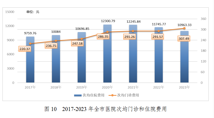 全市各級(jí)各類醫(yī)療衛(wèi)生機(jī)構(gòu)人員經(jīng)費(fèi)支出占43.20%,比上年增加1.92個(gè)百分點(diǎn);公立醫(yī)院人員經(jīng)費(fèi)支出占42.4%,比上年提高2.48個(gè)百分點(diǎn)。 (二)醫(yī)療費(fèi)用 1.醫(yī)院門診和住院費(fèi)用。2023年,全市醫(yī)院次均門診費(fèi)用307.49元,較上年上漲5.46%;次均住院費(fèi)用10963.33元,較上年下降6.66%。其中:公立醫(yī)院次均門診、次均住院費(fèi)用分別為288.99元、11162.62元,分別較上年上漲4.21%、-7.27%。
